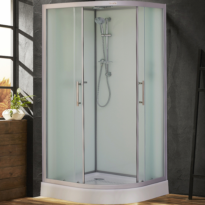 Модель "СR" - угловая кабина со стеклянной крышей, верхним душем с прорезиненными соплами и вентиляционным отверстием. Низкий поддон. Сифон с гидрозатвором. Стекло: 5 мм, переднее - "матовое". заднее - "белое крашеное". Комплектующие: большое овальное зеркало с фацетом, полочка со стаканчиком, смеситель, 5-ти режимная душевая лейка на стойке, мыльница, двойные ролики.